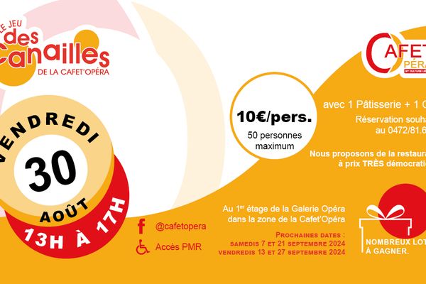 Un évènement cette semaine pour notre Cafet', le jeu des canailles de la Cafet' Opera, il reste encore quelques places pour venir (plus d'info pour s'inscrire sur la photo ci-dessous).