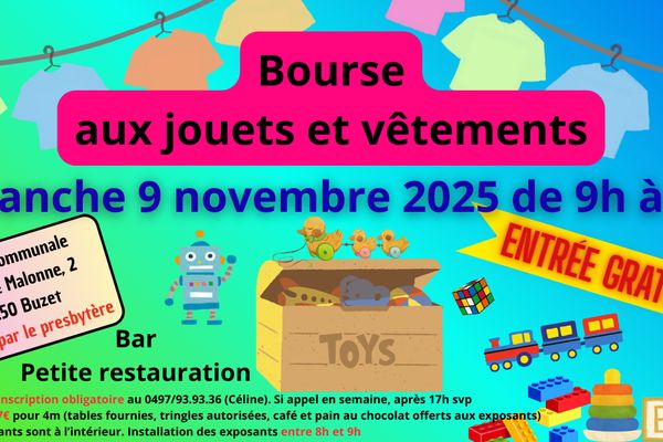 L'Association des Parents de La Maison des Enfants organise une bourse aux jouets et vêtements le dimanche 9 novembre 2025 de 9h à 15h dans les locaux de l'école primaire, rue de Malonne 2 à 5150 Buzet (Floreffe).